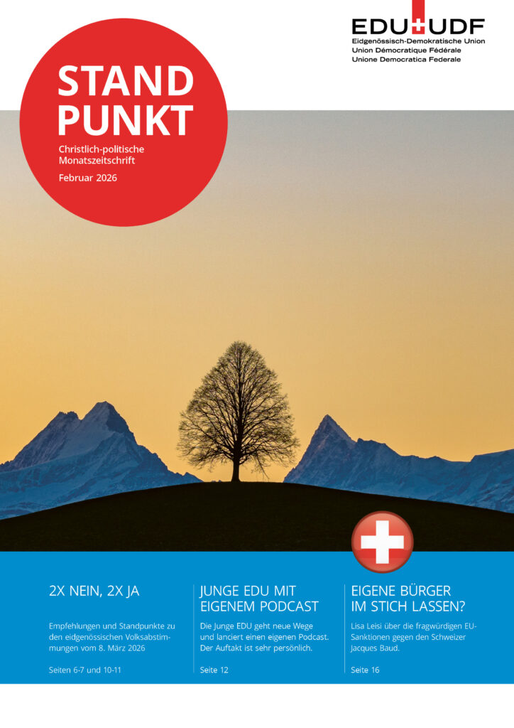 Der Standpunkt erscheint monatlich. Er beleuchtet die Abstimmungsvorlagen und informiert über die Arbeit der EDU in der Schweiz.