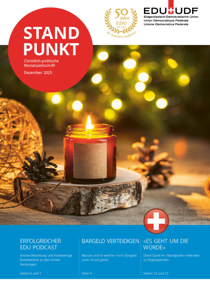 Der Standpunkt erscheint monatlich. Er beleuchtet die Abstimmungsvorlagen und informiert über die Arbeit der EDU in der Schweiz.